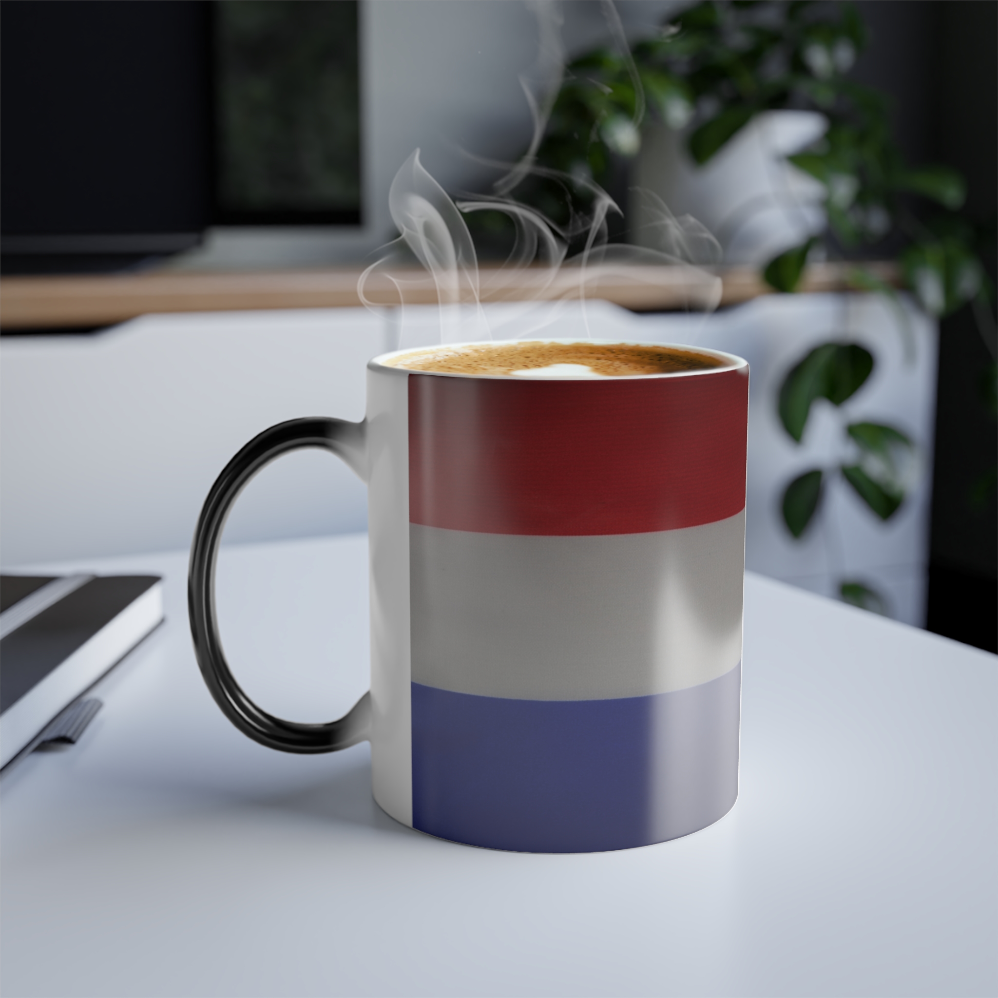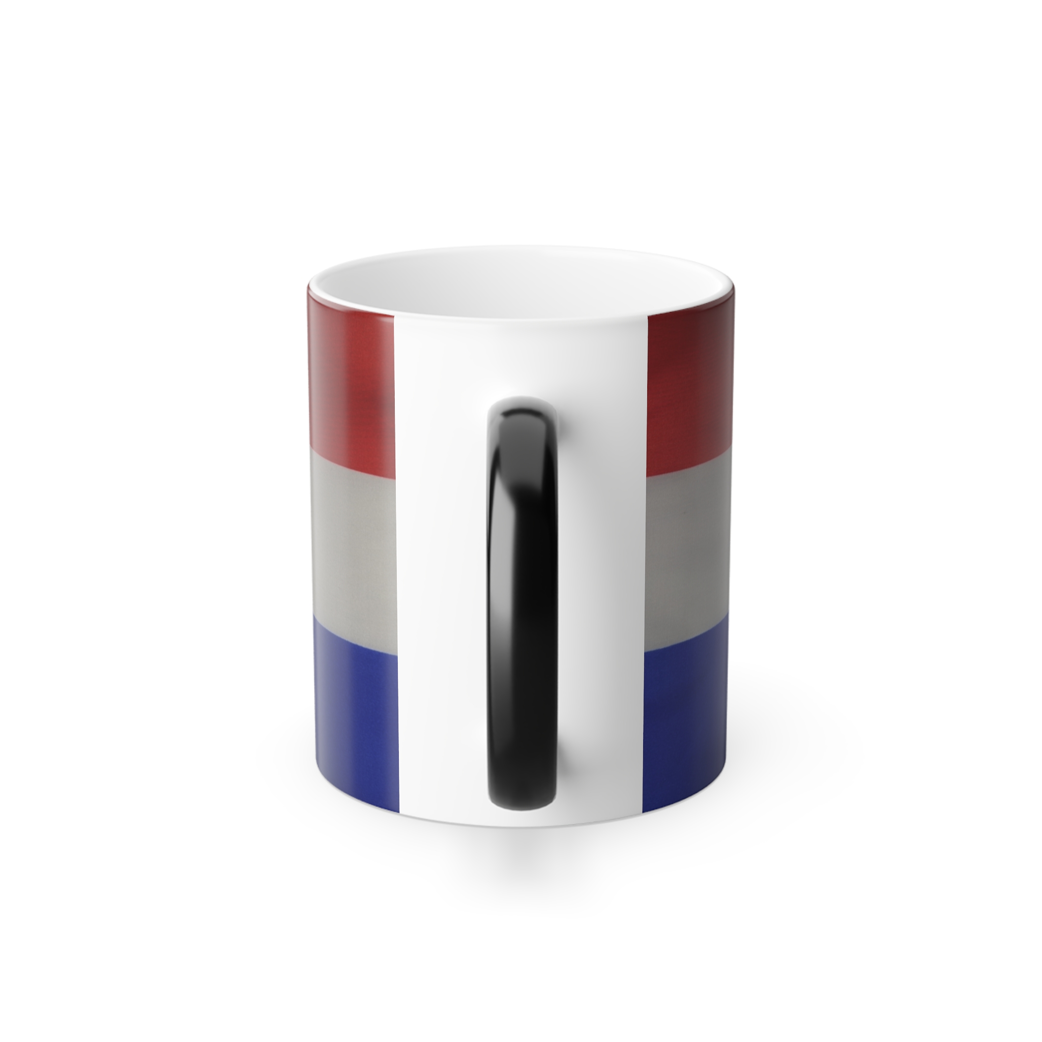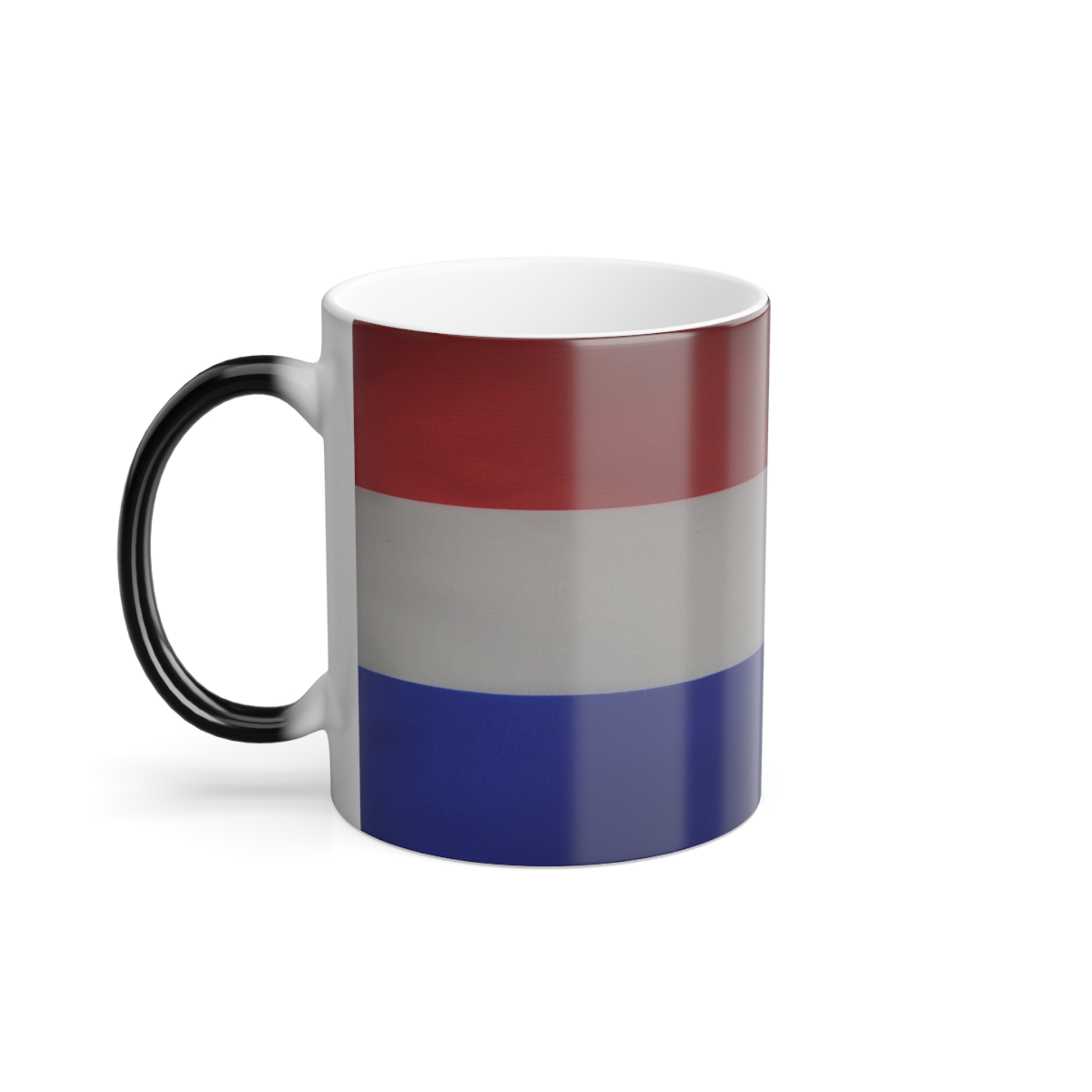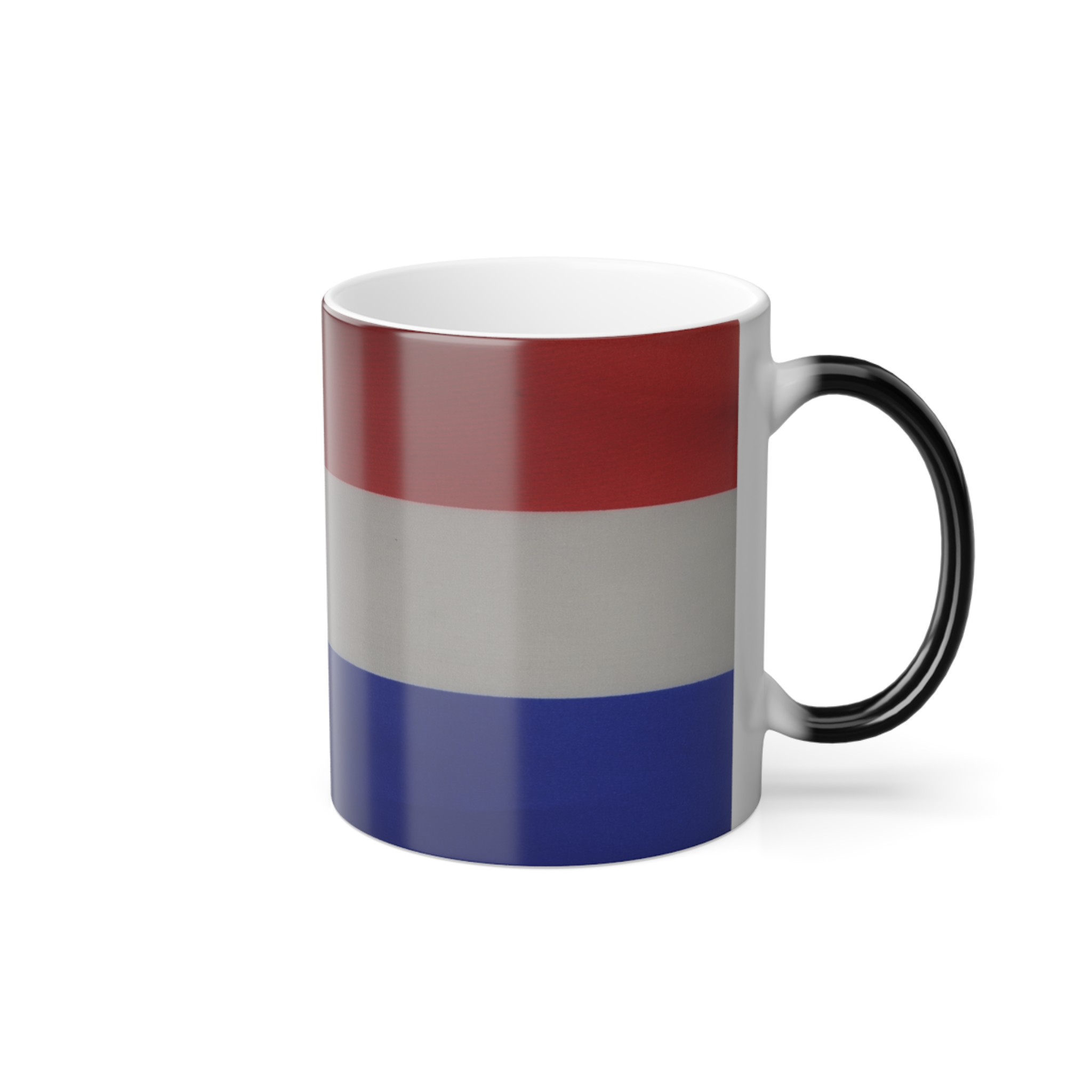Mugs with Flags are super popular gifts for friends or Expats living in your country. This one changes color and will be the gift that keeps on giving. The heat-reactive surface reveals the Dutch Flag once the mug gets warm. The ceramic cup will go back to its original black outside and white inside when it cools down. The C-shaped handle helps keep a sturdy grip. It comes in one size – 11oz (0.33l) – Warning !! with this mug you may drink more coffee or tea 😉